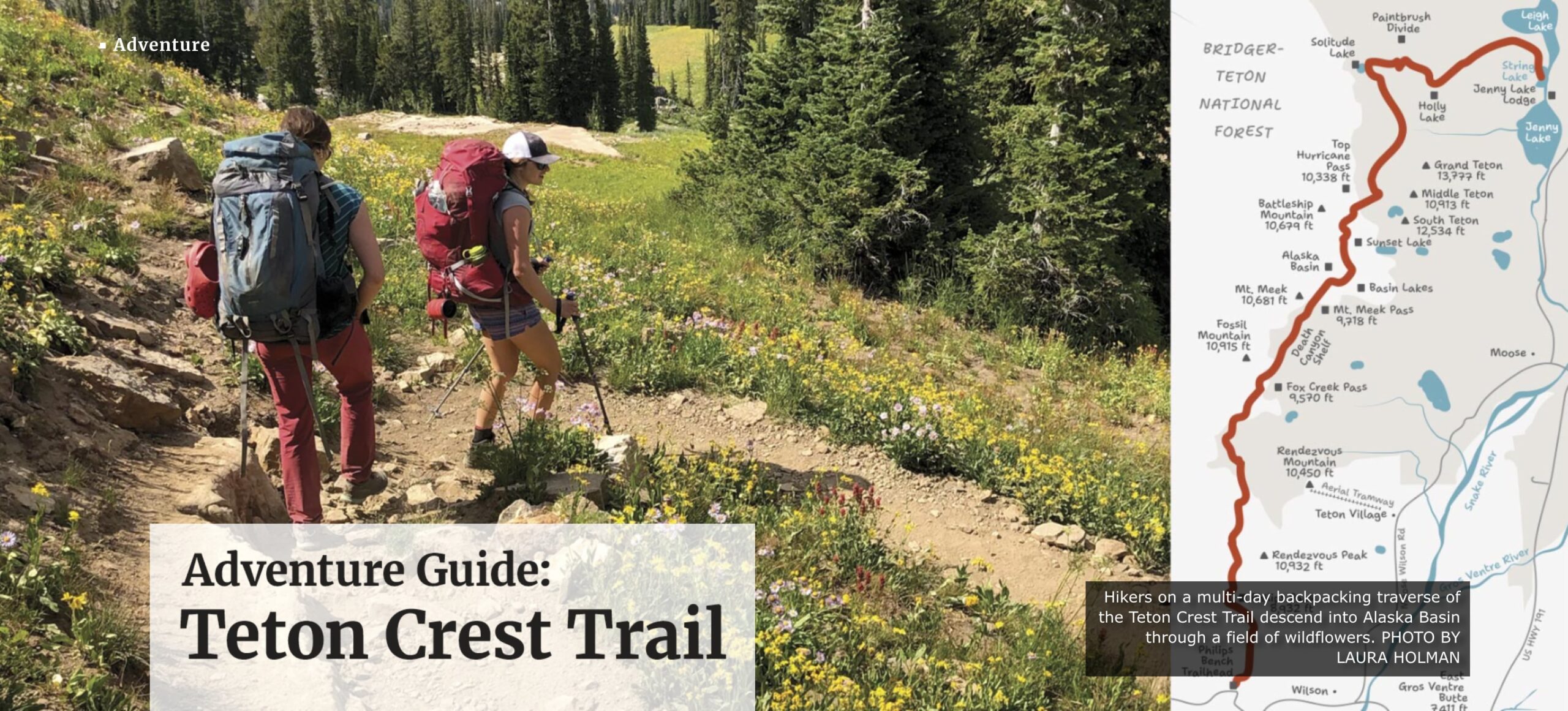 The south-to-north route provides endless views of the Teton Cathedral Group, the three tallest peaks in the park—the Grand Teton, Teewinot and Mount Owen. Beginning at Phillips Canyon trailhead on Highway 22, weave up the pass, past Rendezvous Peak, along Death Canyon, through Alaska Basin, and finish with a 3,000- foot climb up Paintbrush Pass and down Cascade Canyon to collapse in sweet relief in String or Leigh Lake.